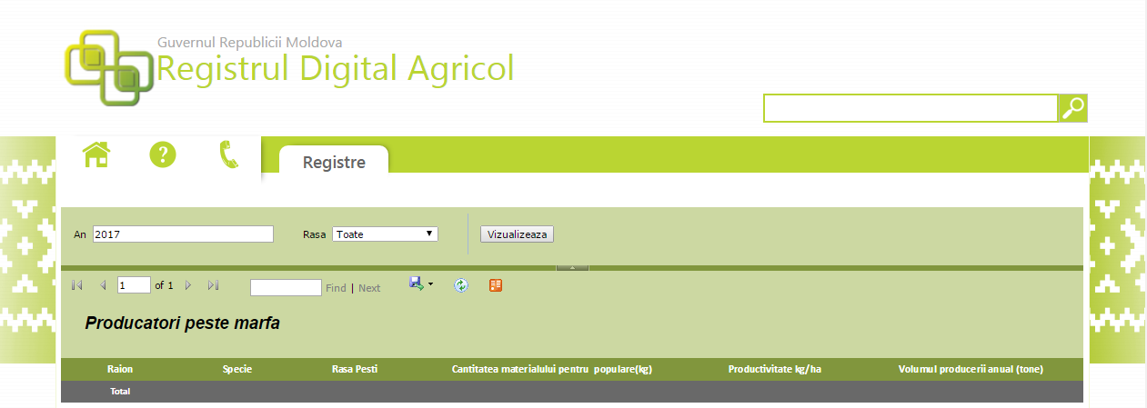 Registrul Crescători pește prăsilă și marfă are scopul extragerii de informații cu privire la producția de pește prăsilă și marfă per specie și entitate economică.