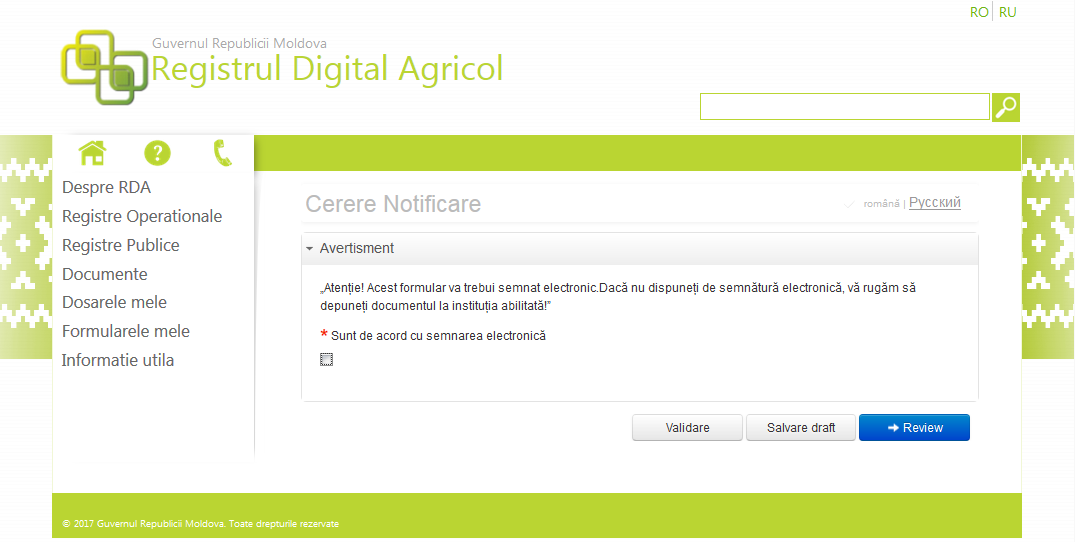 Pentru a completa o cerere de Notificare RDA, utilizatorii autentificați vor efectua click pe Cerere Notificare RDA din zona de portal Documente. În interfață se va încărca formularul web aferent acestei cereri. Pentru a începe completarea cererii, utilizatorii trebuie să bifeze căsuța „Sunt de acord cu semnarea electronică”