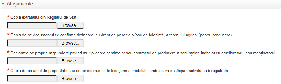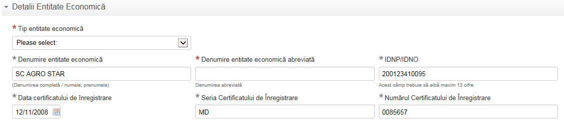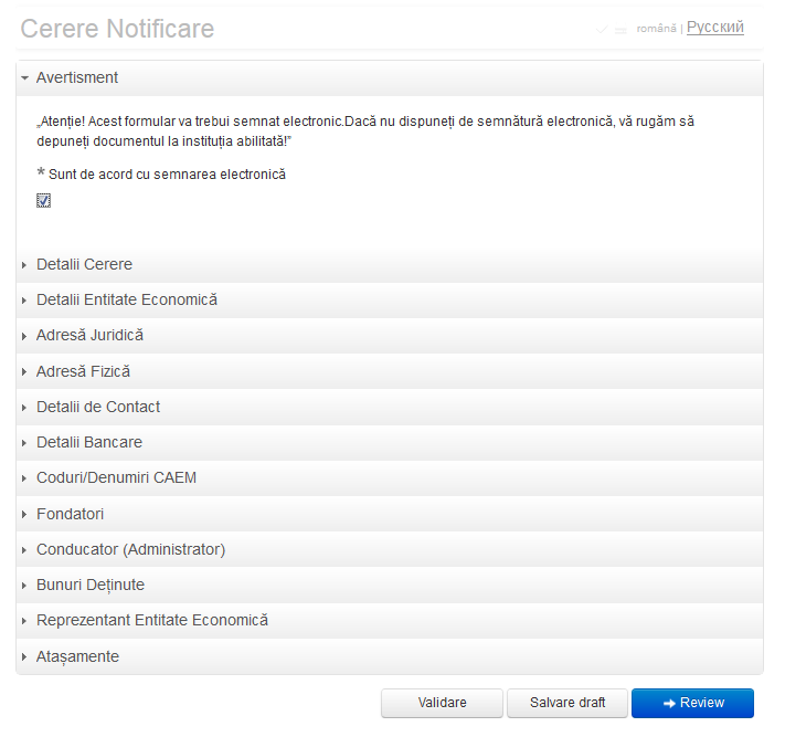 După ce confirmă că sunt de acord cu semnarea electronică utilizatorii trebuie să completeze informațiile (câmpurile) existente în formular. Formularul web este împărțit în mai multe secțiuni (Detalii Cerere, Detaii Entitate Economică, Adresă Fizică, Adresă Juridică etc.) ca în captura de ecran de mai jos.