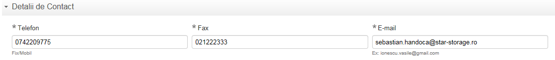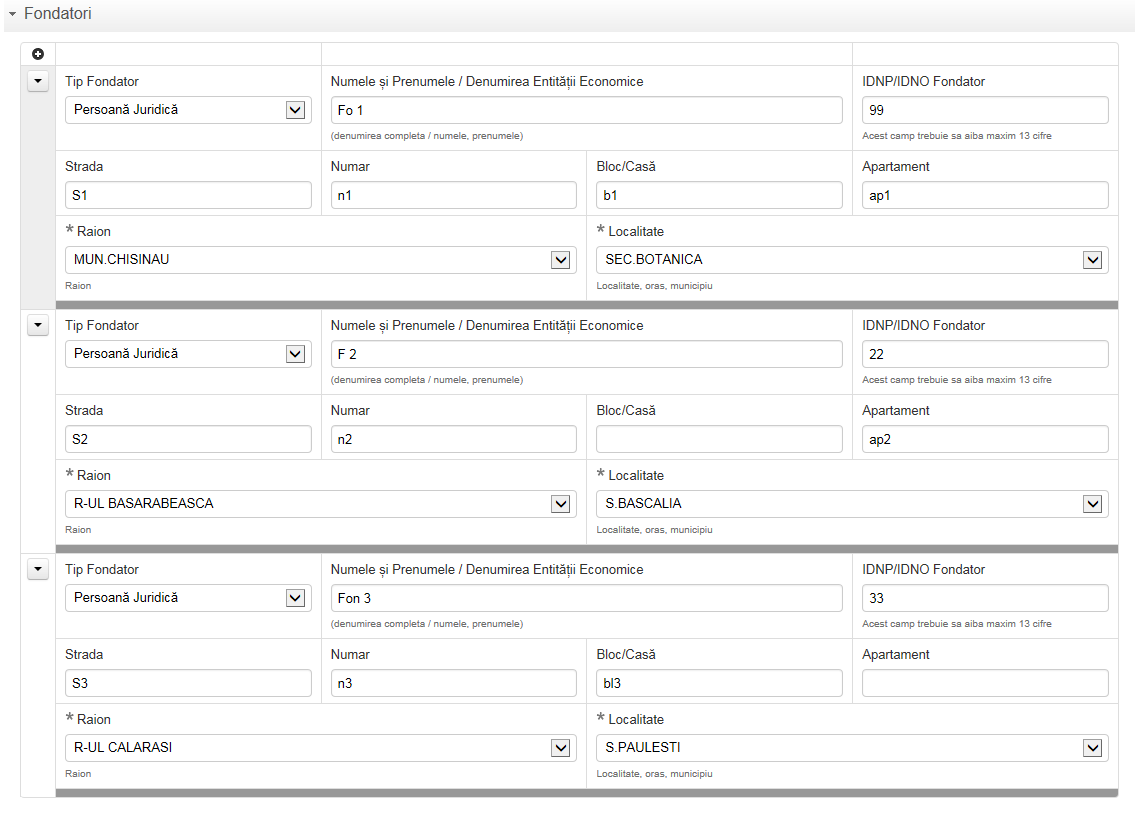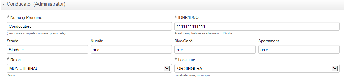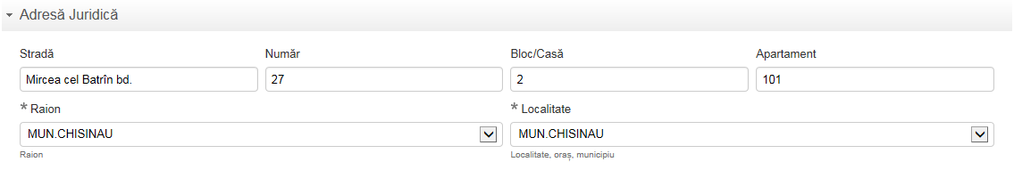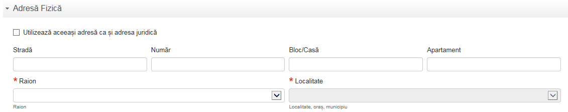Câmpurile din această secțiune se vor completa manual de către utilizator. În cazul în care adresa fizică a entității economice coincide cu adresa juridică se poate bifa căsuța „Utilizează aceeași adresă ca și adresa juridică” pentru a prelua automat valorile completate în secțiunea respectivă.