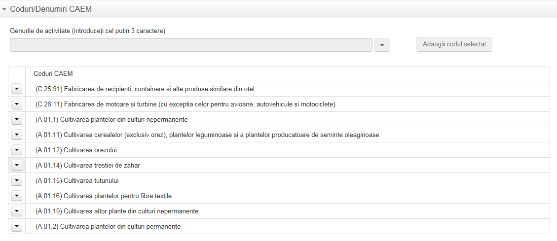 Pentru a introduce coduri CAEM suplimentare se completează minim 3 caractere din denumirea codului CAEM în, câmpul „Genurile de activitate (introduceți cel puțin 3 caractere)”. Sistemul afișează automat o lista de selecție conținând coduri CAEM din nomenclatorul de coduri filtrată în funcție te textul introdus de utilizator. Utilizatorul va alege unul dintre codurile din listă și apoi efectuează click pe butonul „Adaugă codul selectat”. Ca rezultat, acesta va fi inclus în tabelul de Coduri CAEM aflat puțin mai jos în interfață. Se va introduce cel puțin un cod CAEM și nu mai mult de 10 coduri CAEM