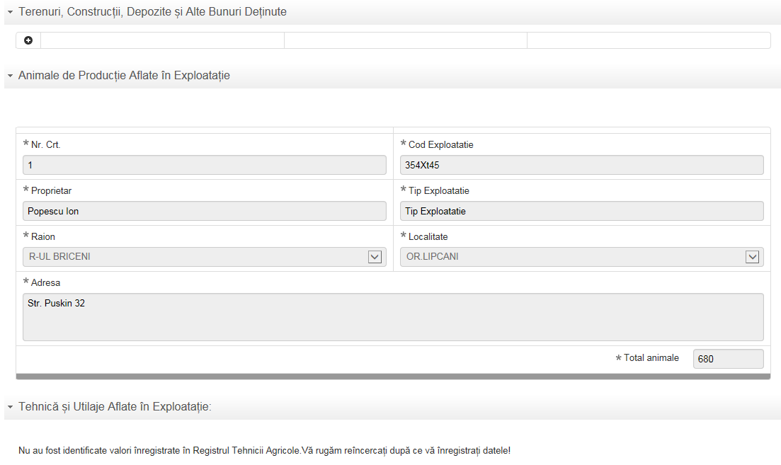 Informațiile referitoare la Animale de producție aflate în exploatare și Tehnică și utilaje aflate în exploatație sunt preluate din integrări cu alte sisteme.