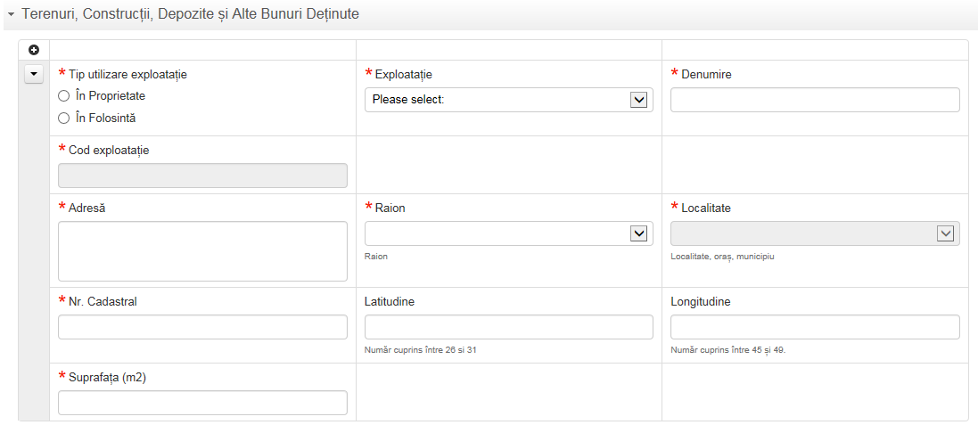 Pentru a adăuga informații referitoare la terenurile, construcțiile sau a altor bune deținute se efecutează click pe butonul și se completează câmpurile din imaginea de mai jos pentru fiecare bun:
